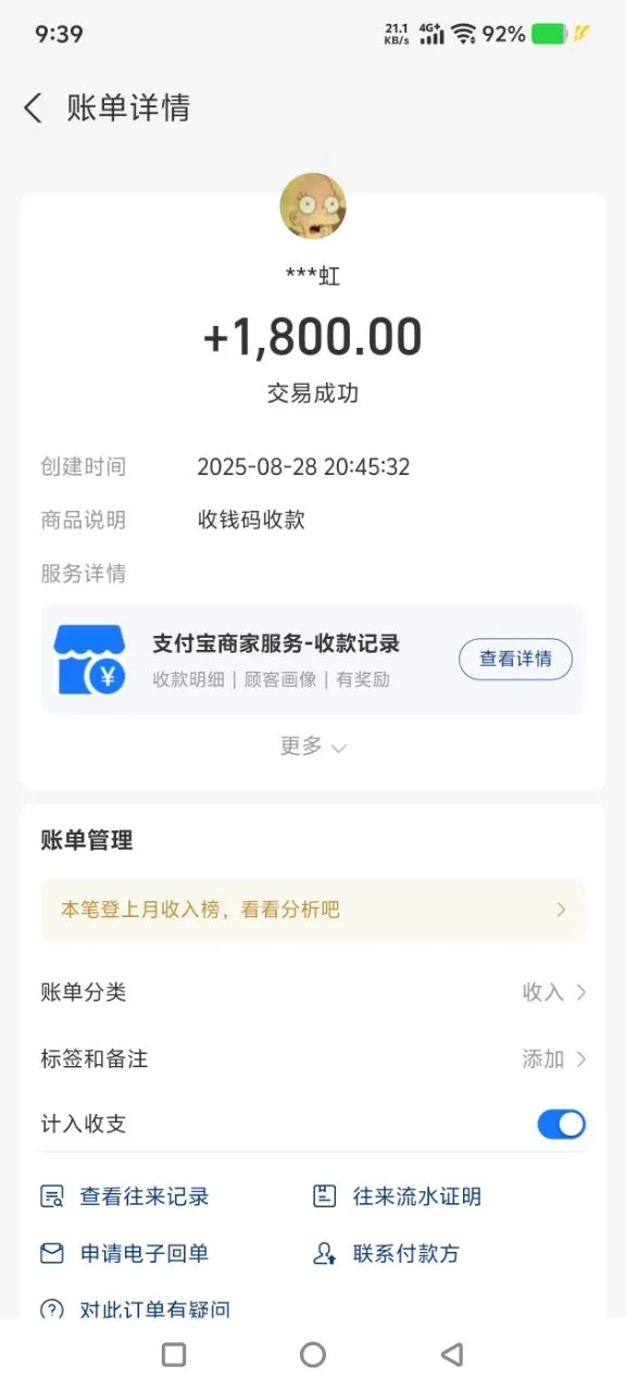 他支付宝付了我1800元。我帮他买了东西交付给他。